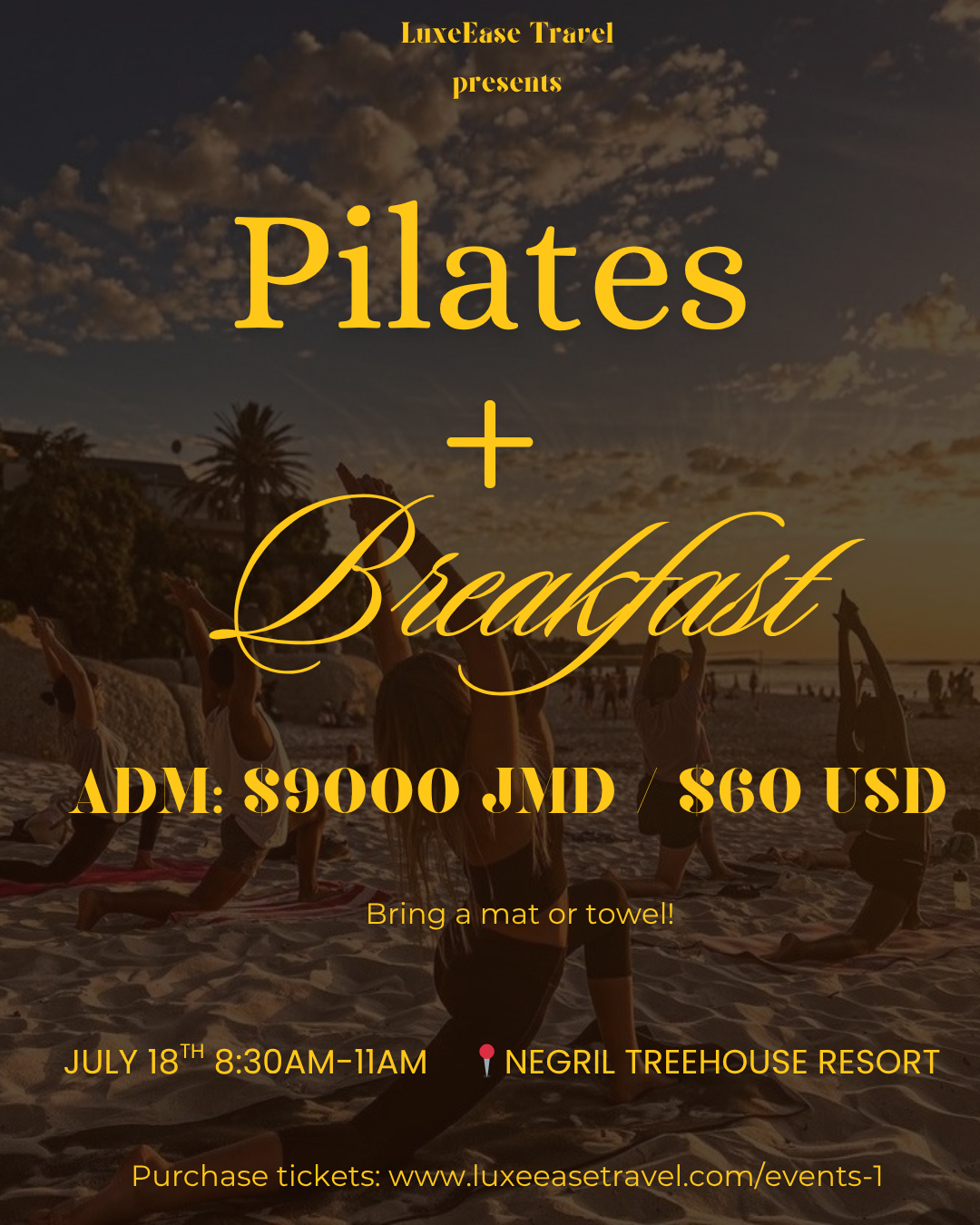 Included: Pilates Entry, Full Jamaican Buffet Breakfast, Juice/Coffee, and Gift Bag.